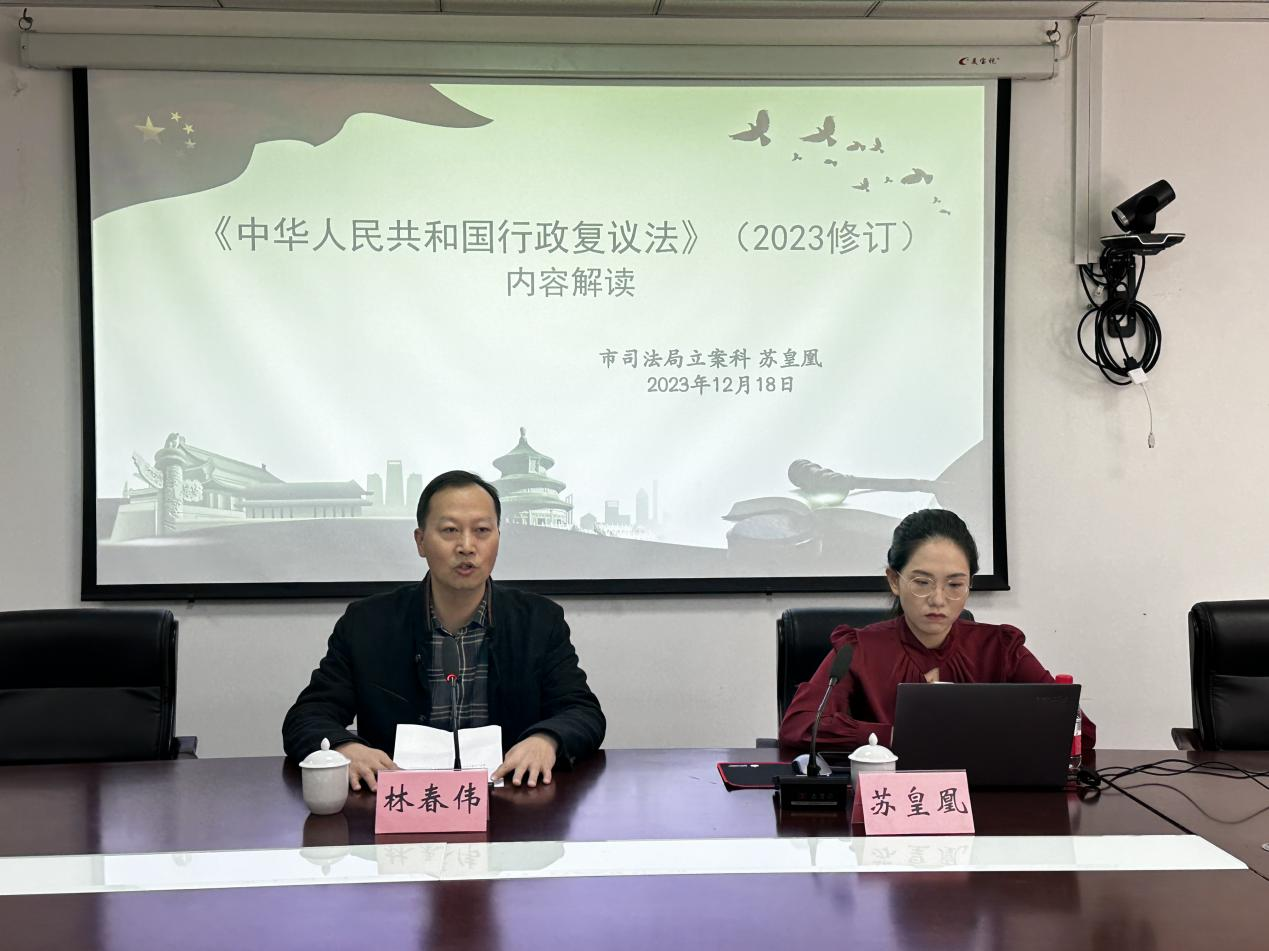 2023年9月1日,十四届全国人民代表大会常务委员会第五次会议审议通过了新修订的《中华人民共和国行政复议法》。为了推进各级各部门深入学习贯彻新修订的《中华人民共和国行政复议法》,切实把握其立法本意和丰富内涵,日前,av探花 司法局、av探花 邀请av探花 司法局四级主任科员苏皇凰同志作专题培训,av探花 司法局立案科科长林春伟主持培训。