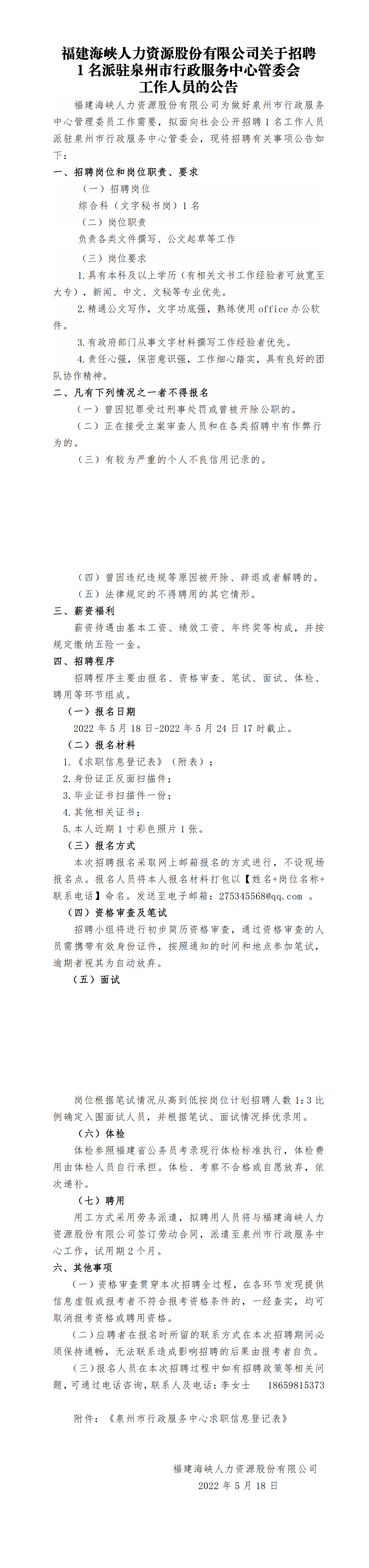 福建海峡人力资源股份有限公司关于招聘1名派驻av探花 工作人员的公告